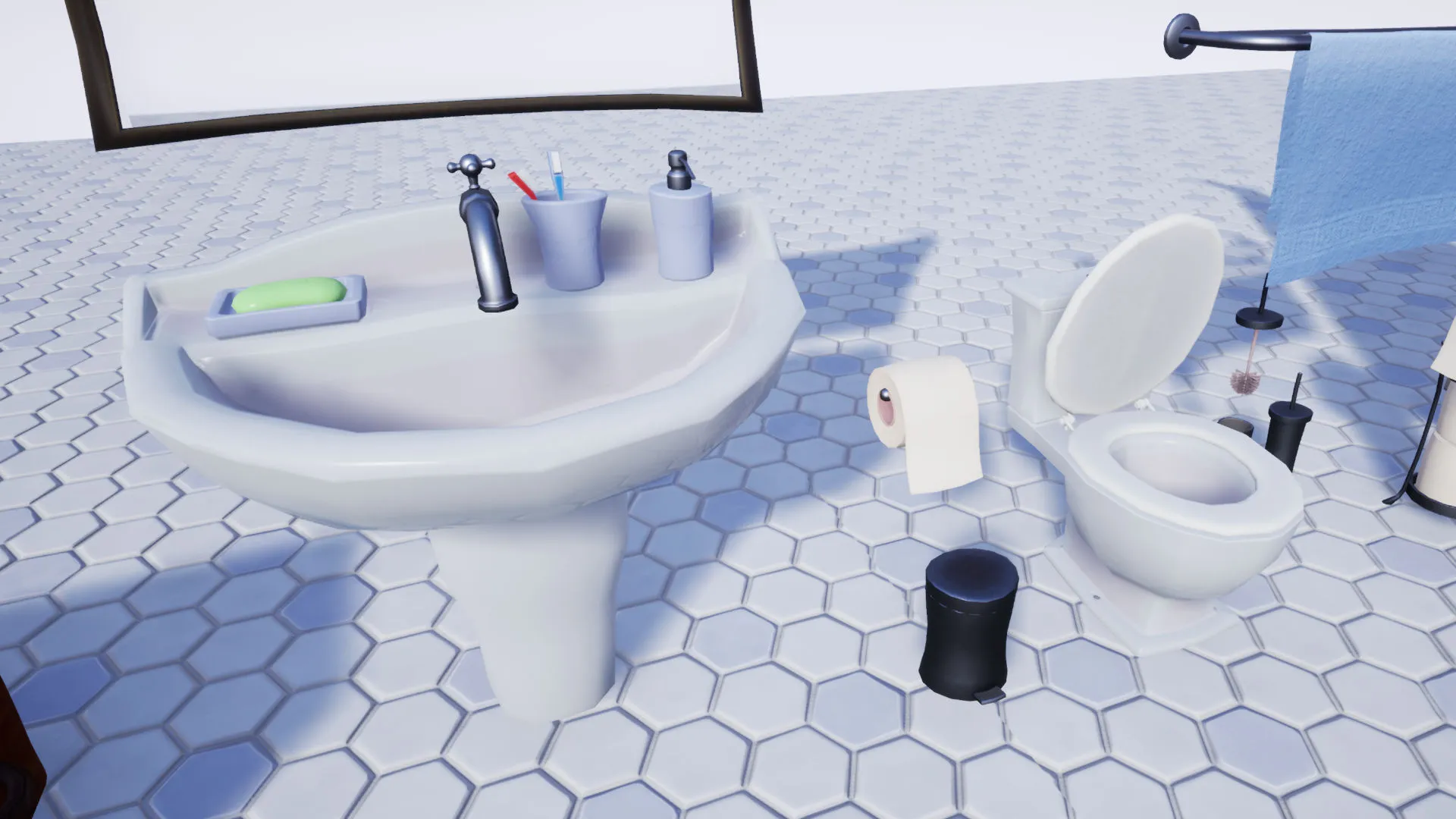 Download this stylized 3D bathroom furniture asset pack for Unreal Engine and Unity. It includes a fully modeled bathroom scene with a shower, toilet, sink, mirror, curtains, towels, and more. The pack contains over 20 stylized 3D models like a toilet, sink, shower, mirror, curtains, towels, toothbrushes, and bathroom accessories. All models feature PBR materials and textures. Easily drag and drop these low poly assets into your game scene. This bathroom furniture pack is perfect for creating stylized environments and visuals. The extra floor material lets you build your own custom bathroom scene. Works with any game engine that supports FBX files. Get everything you need to create a detailed bathroom environment for your next game project!