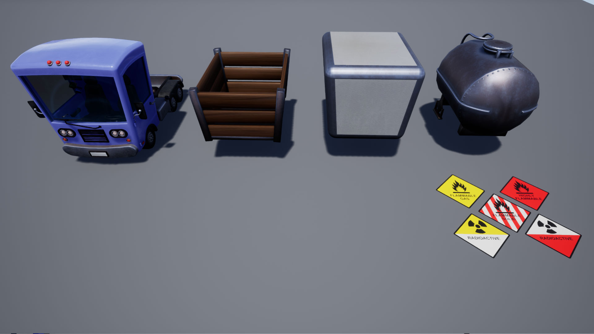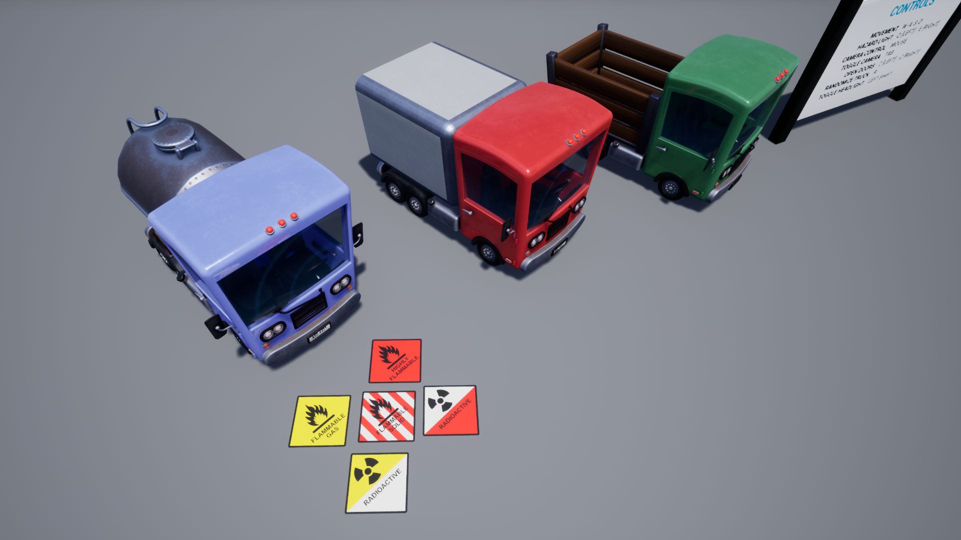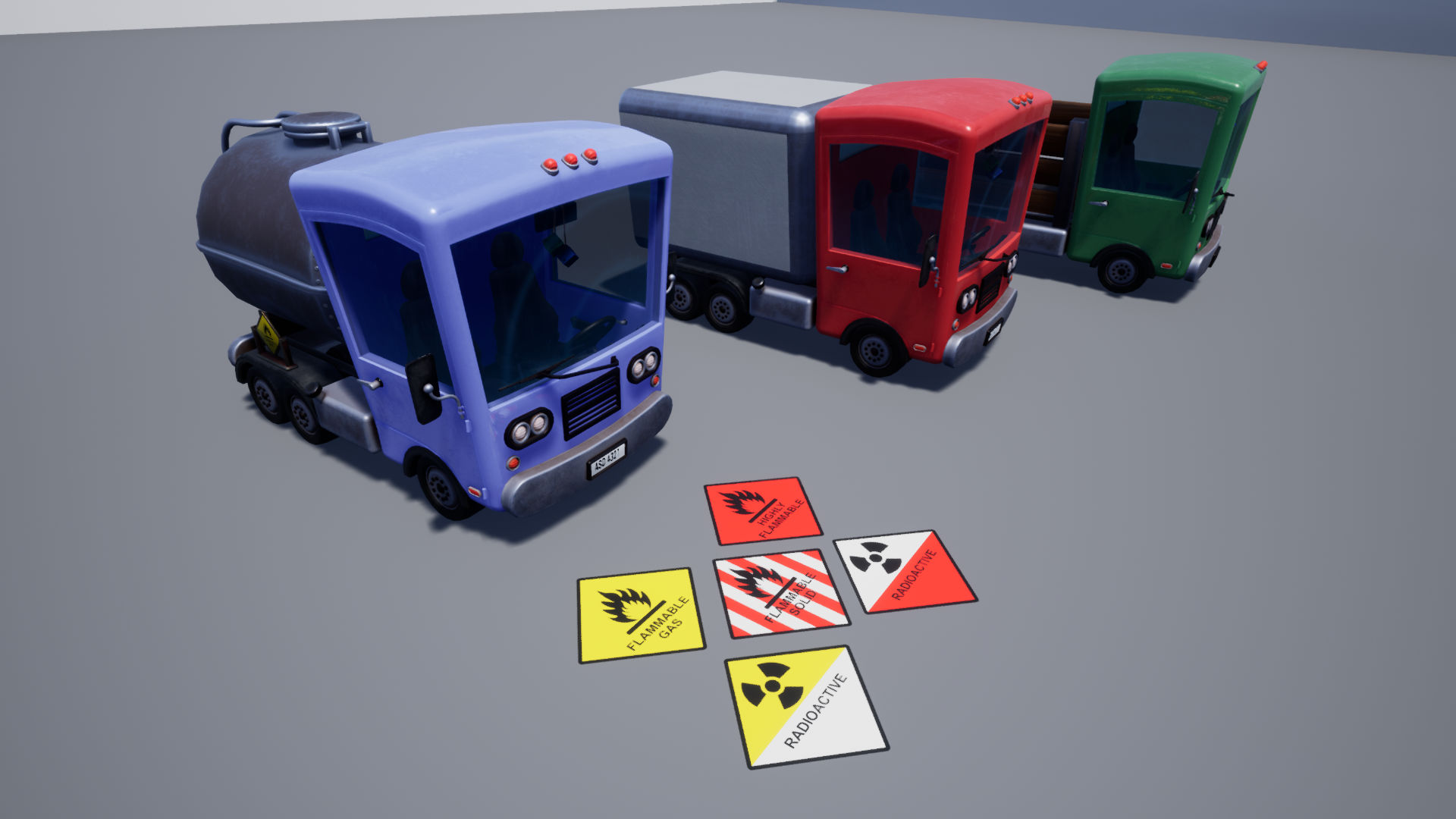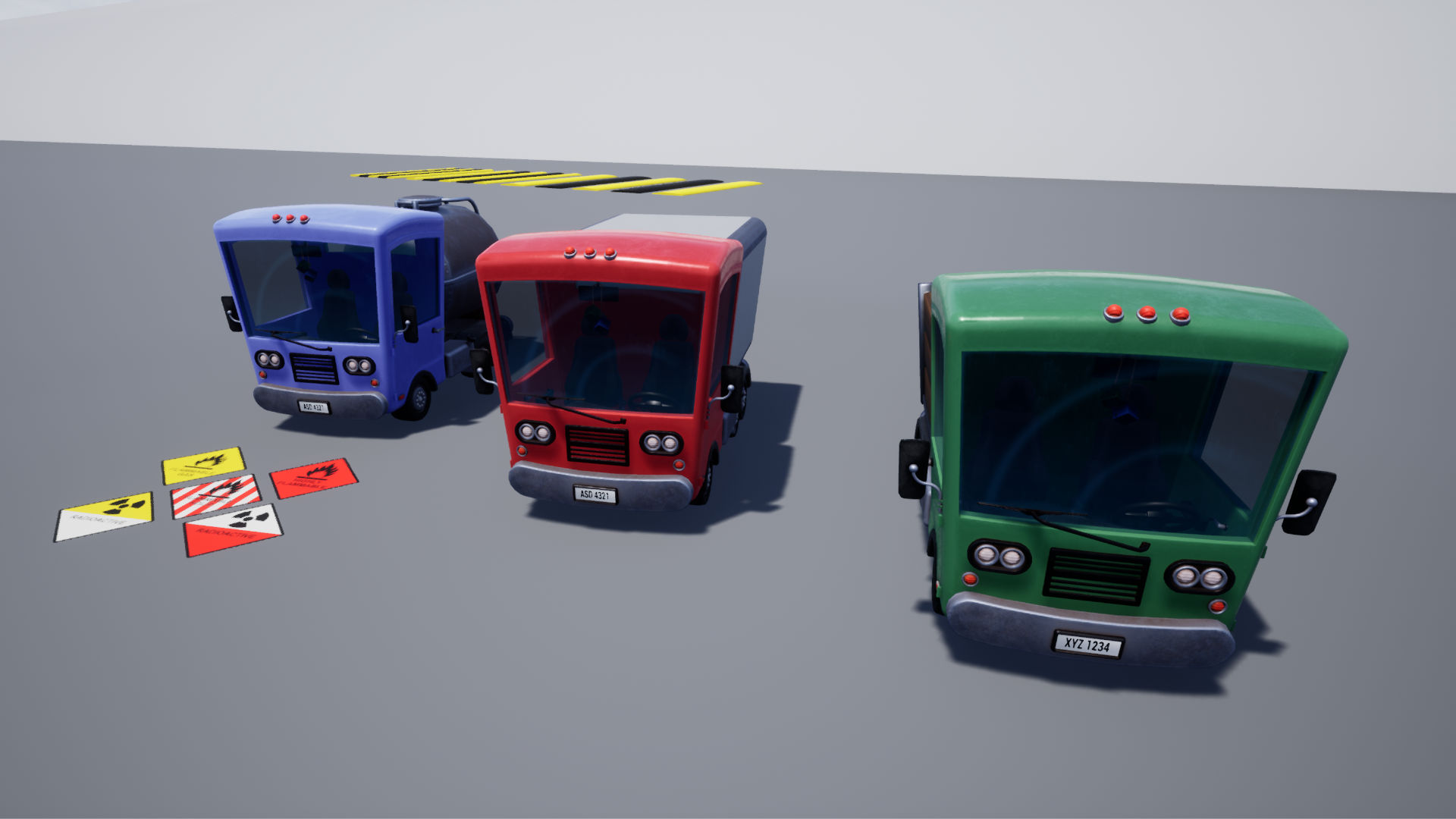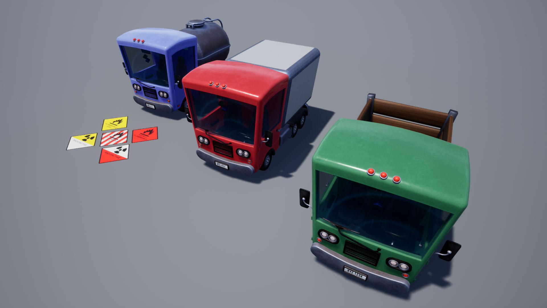 Pack contains a drivable Stylized Truck model with Gasoline Truck, Box Truck, and Trunk Truck options. Suitable for PC/Console ready to use.